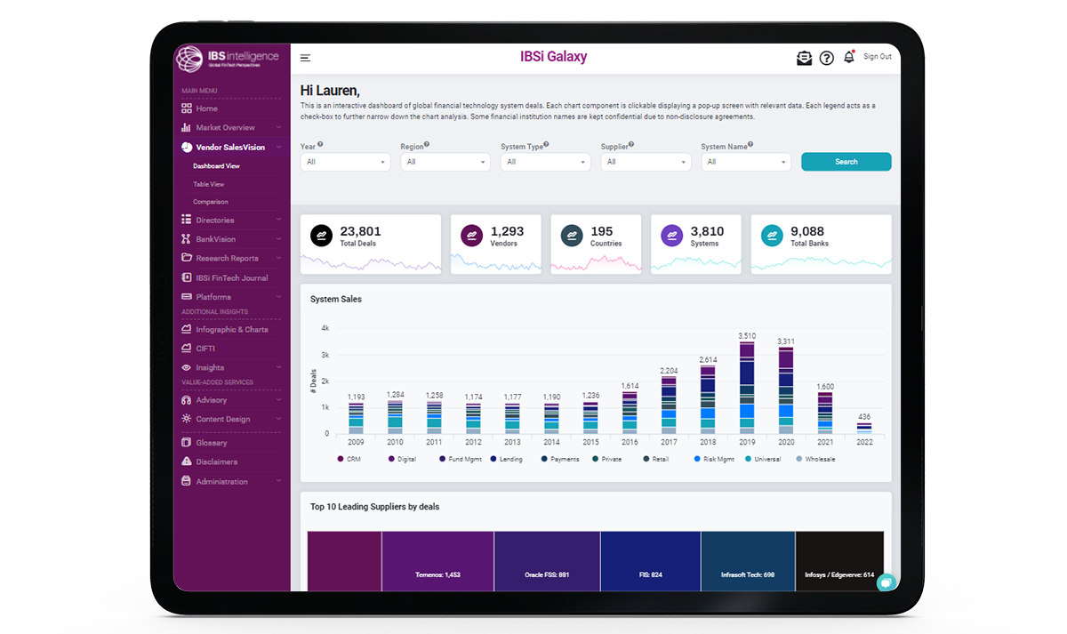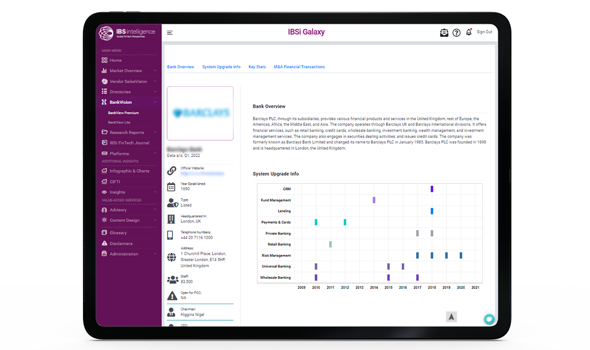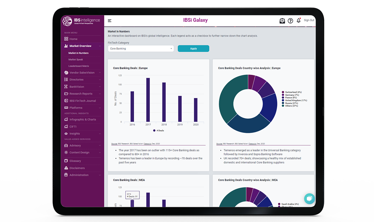 IBSi’s Galaxy portal is a self-service insights and intelligence portal, tracking and analyzing the global BankTech and FinTech landscape weekly. The portal comprises data points in areas of vendor intelligence, bank system intelligence, market intelligence, use-case libraries, and other forms of proprietary data and thought-leadership.
